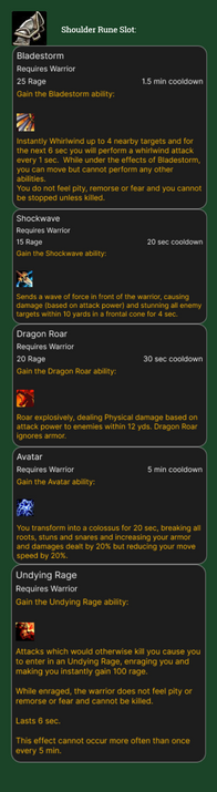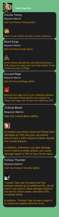 So, like Trauma, if the warrior gets the buff from a Feral or Shaman, he can switch rune, the objective being to break the massive dependence on other classes that the warrior has.
